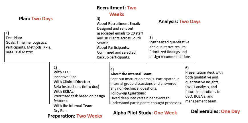 I led an end-to-end alpha and beta pilot study with Mindsource Center employees recruited throughout the South Seattle area accross clinics, schools, and in client homes to introduce the next release of a the Data Face Sheet system for Linux. After introducing the Data Face Sheet, participants were asked to integrate the system into their services, complete discrete trail and precision teaching tasks, and provide feedback on their overall experiences with the beta via SurveyMonkey.